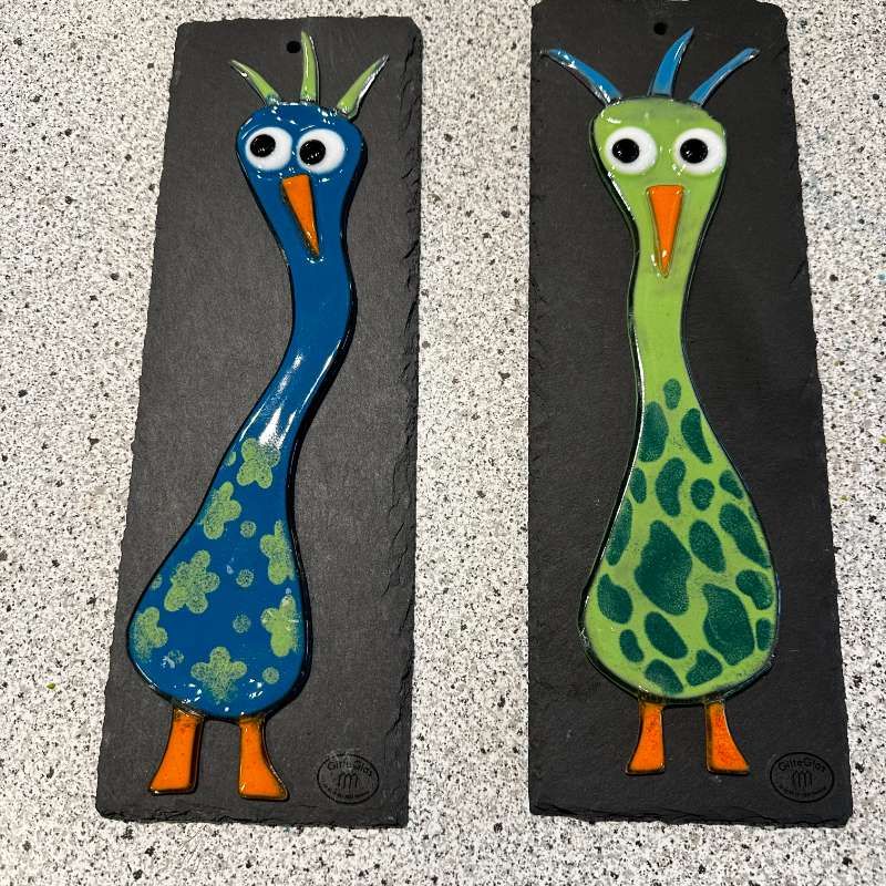 Skiferpladen er 10*30 cm. Fugle i glaskunst er til glæde både for små og store.