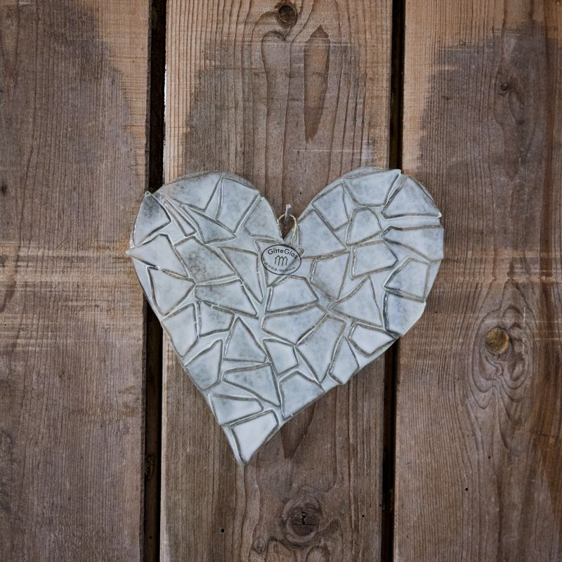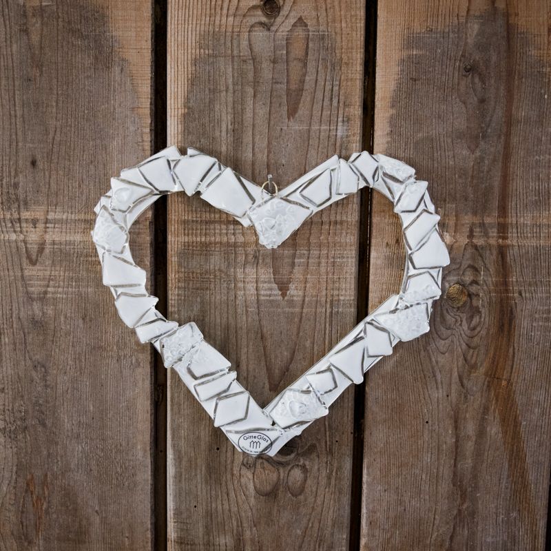 Det enkle og dekorative hvide glashjerte findes i 2 str.