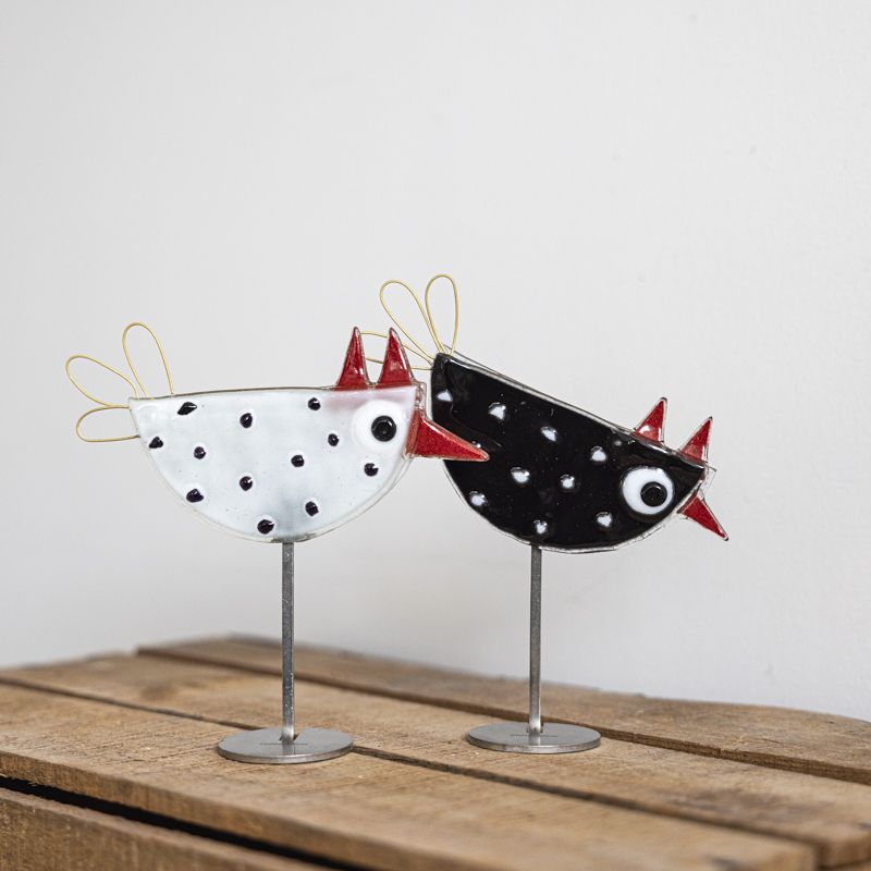 Hønsene sælges som sæt, med en hvid og sort høne.